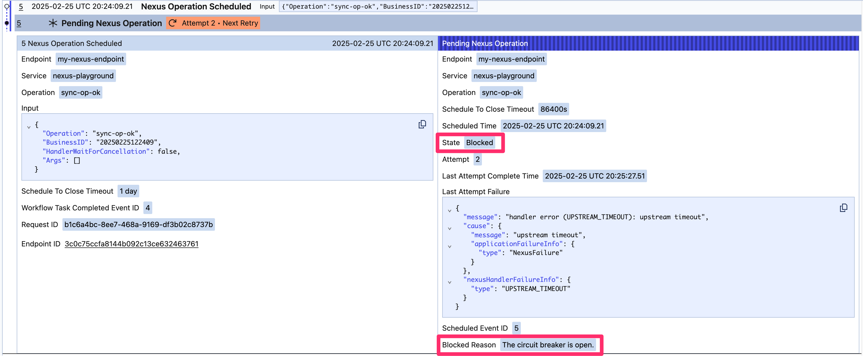Circuit breaker state surfaces in Pending Nexus Operations and Pending Callbacks.